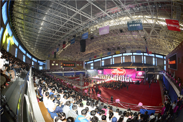 最后,现场齐唱东北大学校歌,校友、师生、亲友团的心紧密连在一起。仪式结束,新娘把手中的手捧花抛向热心服务的志愿者,将幸福传递给她们的师弟师妹。