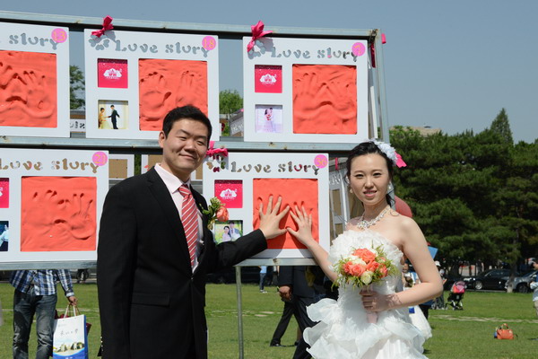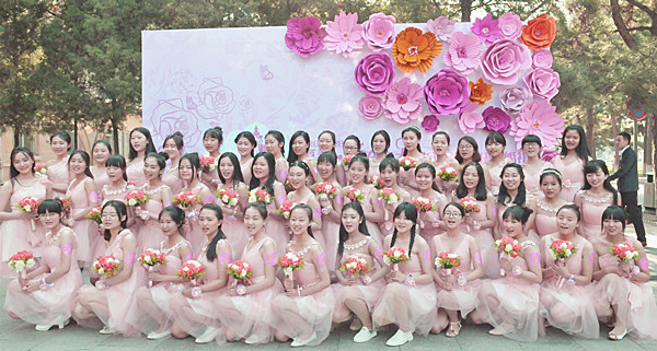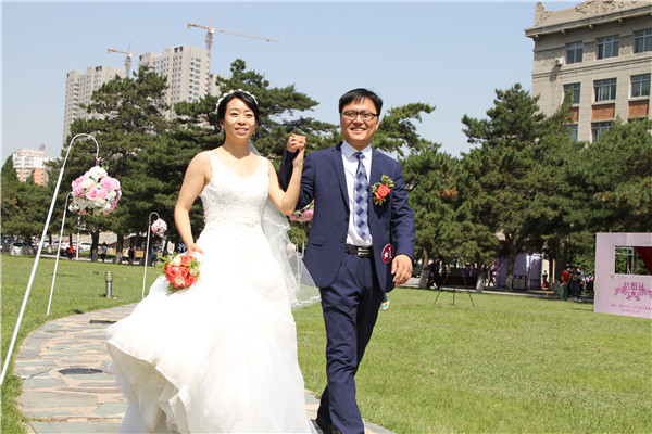 校园一早就热闹了起来,东北大学婚礼一对一志愿者身着粉色的伴娘裙,成为校园里一道亮丽的风景线,她们手持新娘手捧花和为新人准备的资料袋等待着校友新人的到来。新人们报到后,志愿者们引导校友新人们在教室和校园中精心布置的景点前合影留念。绿荫小路上、春华园里、冶金草坪上、昔日教室中,校友新人穿着婚纱、礼服,尽情享受着甜蜜的爱情和纯真的幸福。