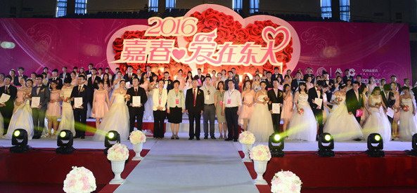 花香踏着五月的和风,伴着青草的摇曳,吹进了南湖畔这座充满爱意的校园。5月28日,“嘉春•爱在东大”东北大学2016校友集体婚礼在东北大学校园隆重举行。来自全国九省市的41对校友新人回到母校,昔日的东大学子洋溢着幸福的笑容,在这个充满青春回忆的地方,在母校师生的见证下完成了人生最重要的仪式,许下了一生的承诺。校长赵继、校党委常务副书记熊晓梅以及14位教师代表出席集体婚礼典礼仪式,41对新人的亲友参加典礼。