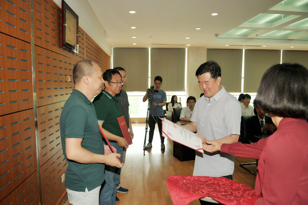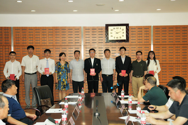 杨明为新任毕业生成长导师刁奇、郭文立、关英等校友代表颁发聘书