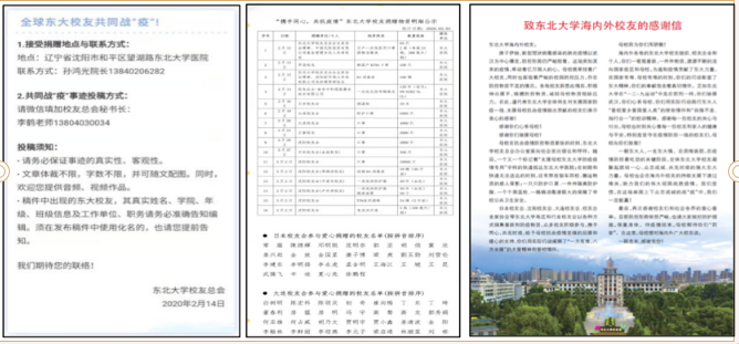 东北大学的校友捐赠新闻荣登教育部网站。据统计,支部通过校友总会微信公众号推送“携手同心,共抗疫情,东大校友在行动”共七期,学校收到校友捐赠的防护口罩60000余只,消毒液2000余公斤、隔离衣防护服百余件,为学校疫情防控关键时期做出重要贡献,践行特殊时期爱校护校的使命担当。