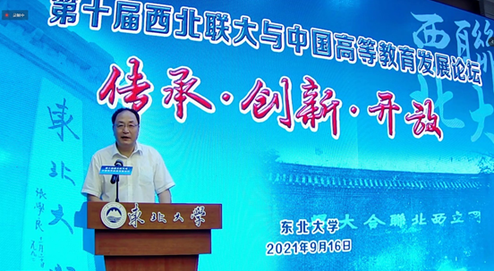 9月16日,由东北大学承办的第十届西北联大与中国高等教育发展论坛以“线上+线下”相结合的方式召开。光明日报社教育部主任田延辉、辽宁省社科联党组书记、主席石坚、沈阳市社科联党组书记、主席李宏印、沈阳日报社党委书记、社长程谟刚、三台县委常委、宣传部部长董卓锴、光明日报辽宁记者站负责人刘勇等应邀出席论坛。北京师范大学、天津大学、西安交通大学、西北工业大学、西北农林科技大学、西北大学、西北师范大学、河北师范大学、中国矿业大学、陕西理工大学、西安理工大学、西安科技大学、西安工程大学、西昌学院等高校领导、有关部门负责人、专家学者和师生代表百余人参加了论坛。东北大学副校长孙雷在主楼824会议室主会场出席论坛,校党委宣传部、对外联络与合作处、档案馆、文法学院、马克思主义学院等在校师生代表共同在主会场参加论坛。