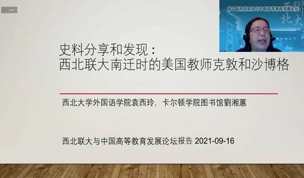 美国明尼苏达卡尔顿学院图书馆编目和数字服务图书馆刘湘蕙馆员《史料分享和发现:西北联大南迁时的美国教师克敦和沙博格》报告。