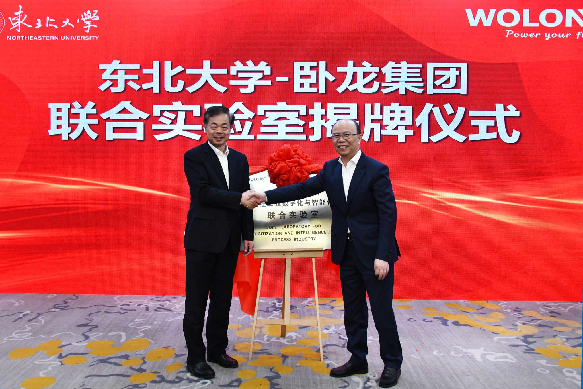 冯夏庭与陈建成共同为“东北大学与卧龙集团流程工业数字化与智能化联合实验室”揭牌。
